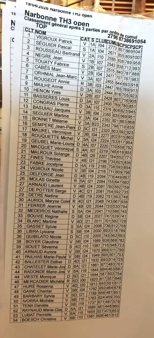 Ce dimanche avait lieu le Festival de Narbonne (TH3) dans la très belle salle des foudres au Domaine de Montplaisir. Il a réuni 54 joueurs venus du comité . Ce tournoi était en multiplex avec Aix-les-Bians, Cosne, Niort, Pontarlier, Thedding et Vallet réunissant 495 joueurs !