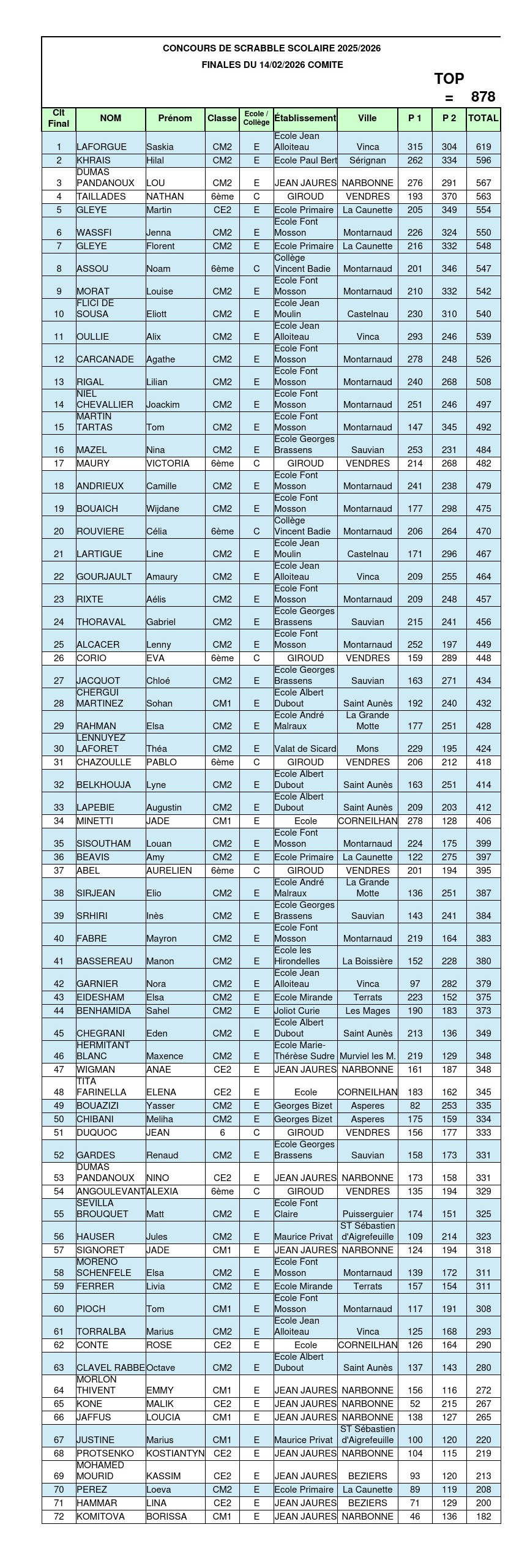 Voici le classement cumulé des deux finales : (sur fond bleu les élèves qui ont disputé la finale à Montpellier, sur fond blanc à Béziers)